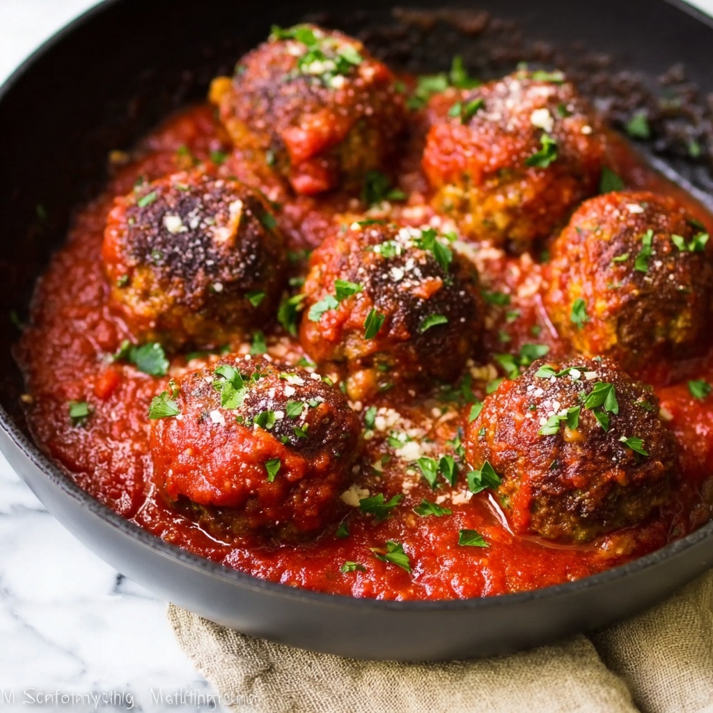 Enjoy these authentic Italian meatballs made from a flavorful mix of ground beef, pork, and veal, combined with fresh breadcrumbs, Pecorino Romano cheese, and aromatic herbs. Baked to perfection and then simmered gently in rich tomato sauce, these tender meatballs are a classic Italian comfort food perfect for serving with pasta and garnished with ricotta and fresh basil.