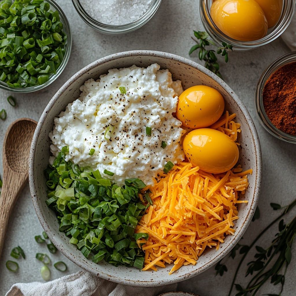 - Combine Ingredients: In a mixing bowl, thoroughly combine the cottage cheese, eggs, shredded cheese, chopped green onions, salt, black pepper, garlic powder, and paprika to create a uniform mixture.
