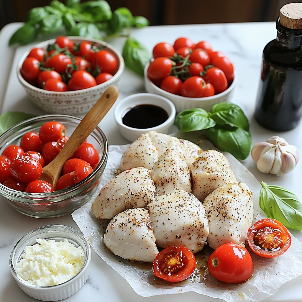 Gathering the right ingredients is the first step to nailing this dish. You’ll find the ingredients straightforward but essential — each one brings something important to the table, from the juicy chicken base to the fresh, aromatic tomato topping and creamy cheese that melts just right.