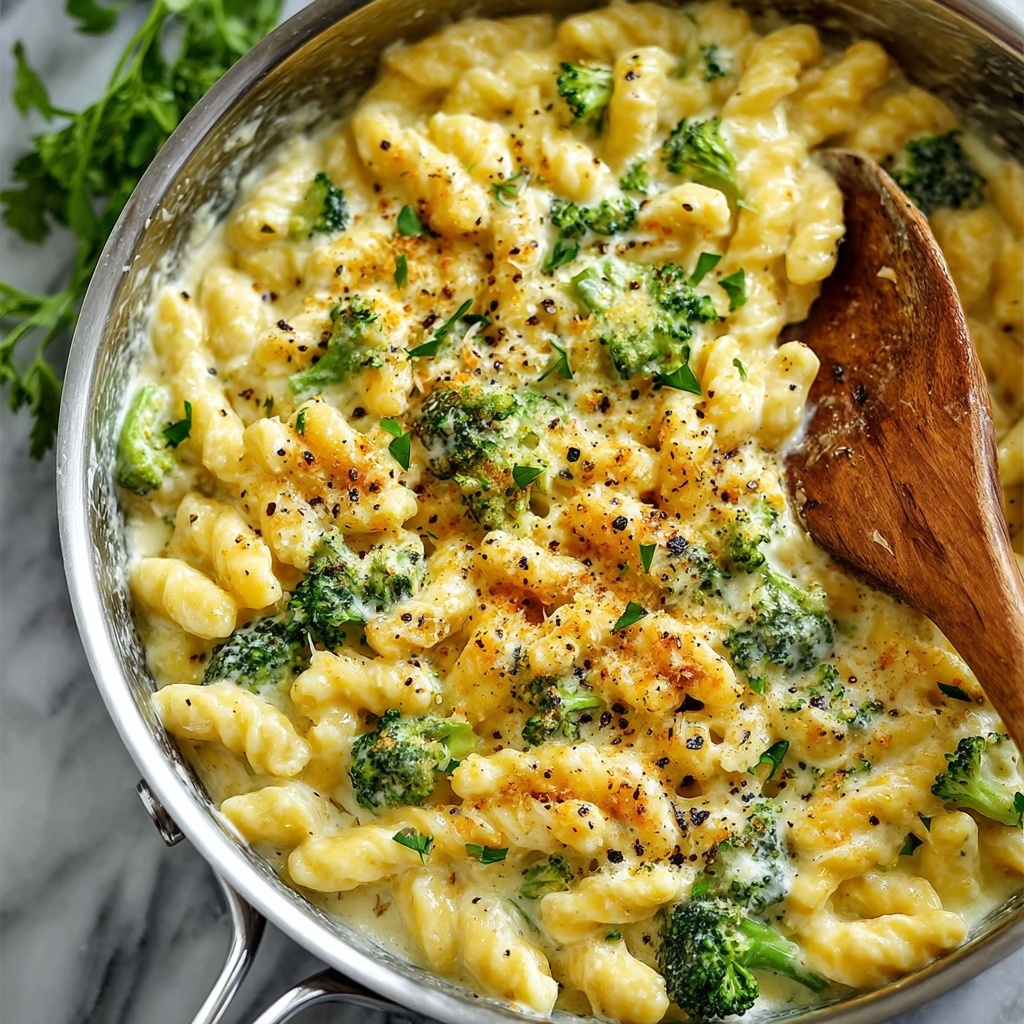 A creamy, comforting cheese pasta featuring tender gemelli pasta and finely chopped broccoli in a flavorful cheddar and Parmesan cheese sauce, made with a rich blend of chicken broth, half and half, and aromatic spices. This dish is perfect for a cozy weeknight dinner that comes together quickly on the stovetop.