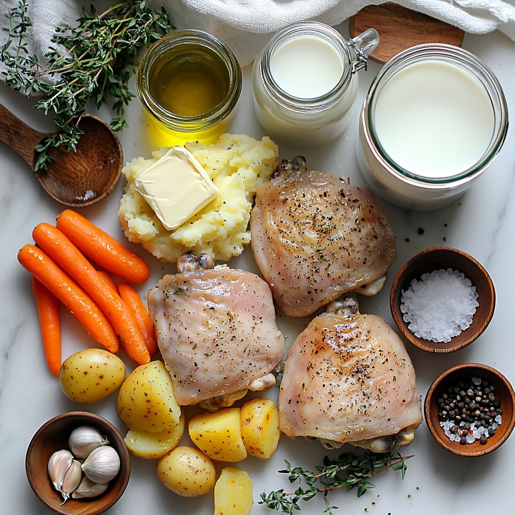 Start by seasoning those lovely chicken thighs generously with salt and pepper. Heat olive oil in a large skillet over medium-high heat, then place the chicken skin-side down. Let them cook until the skin turns a beautiful golden brown and crispy, about 5 to 6 minutes. Flip and sear the other side for another 4 to 5 minutes before removing them from the pan. This step locks in flavor and creates the perfect crust for your Creamy Herb Chicken Thighs with Roasted Carrots and Mashed Potatoes Recipe.