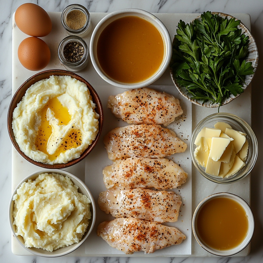 Gathering your ingredients for this recipe is wonderfully straightforward, and each one plays a pivotal role in turning simple staples into an unforgettable meal. From the crispy crust on the chicken to the creamy mashed potatoes and luscious gravy, every component adds depth, texture, and color to your bowl.