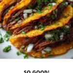 - Assemble Tacos: Spoon the shredded beef mixture onto each fried tortilla, fold them, and serve immediately topped with fresh cilantro and diced onion. Optionally, serve with extra sauce from the crock pot on the side for dipping.
