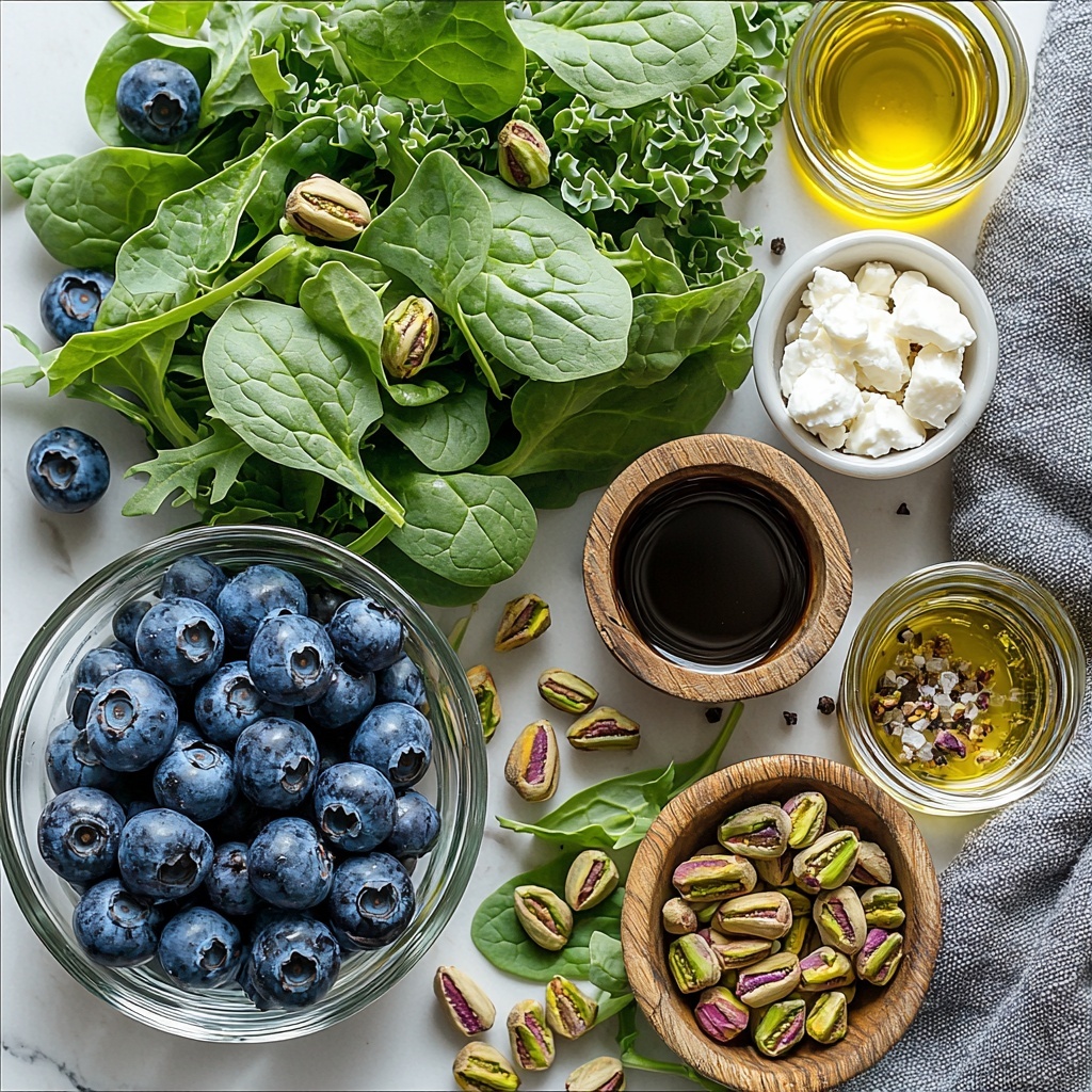 Start by washing your blueberries gently under cool running water to keep them firm and juicy. Make sure to dry them well with a towel so your salad doesn’t get watery. For the greens, rinse and spin dry any spinach, kale, or arugula you’re using—this ensures they stay crisp and fresh. Don’t forget to shell your pistachios and chop them roughly; this adds a wonderfully satisfying crunch with each forkful.