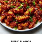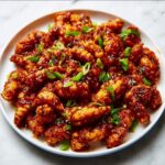 Dragon Chicken is a fiery and flavorful Indo-Chinese dish featuring crispy fried chicken pieces tossed in a spicy, tangy, and slightly sweet sauce made from garlic, ginger, dried chilies, ketchup, soy sauce, and chili garlic sauce. Garnished with green onions, toasted sesame seeds, and crunchy fried vegetables, it pairs perfectly with steamed rice, noodles, or lettuce cups for a delightful meal full of bold flavors and textures.