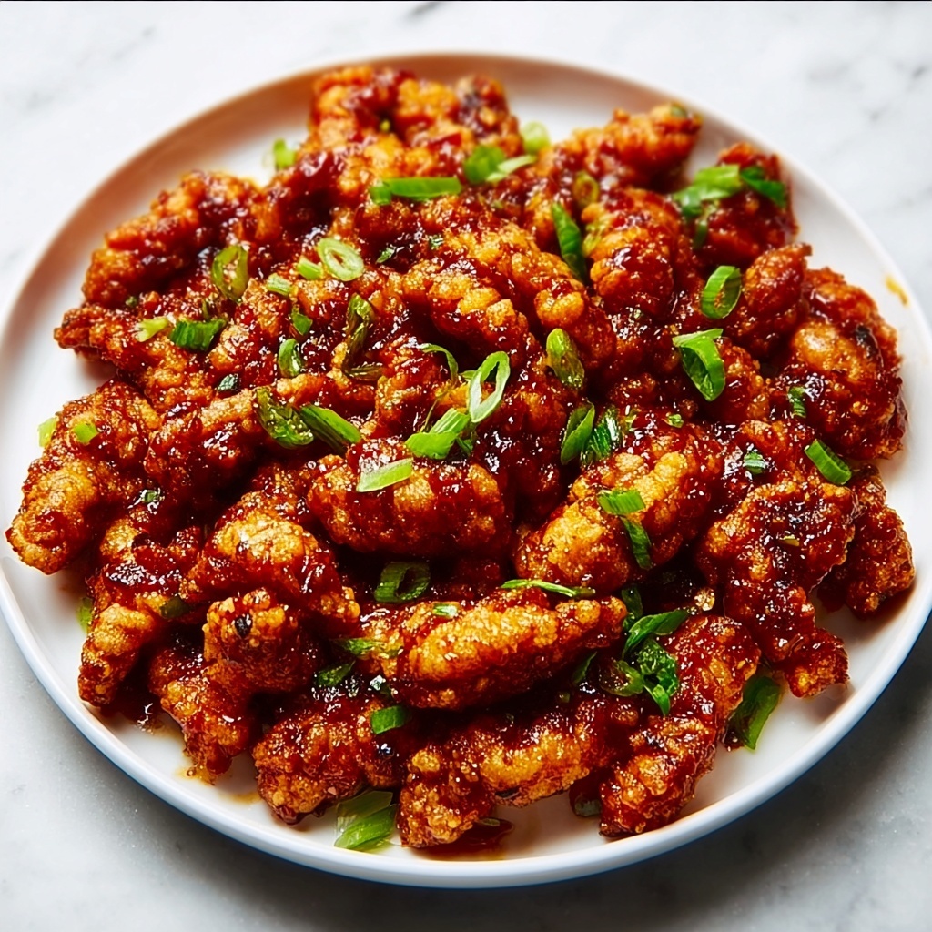 Next, heat vegetable oil in a skillet over medium-high heat—enough for shallow frying. Fry the chicken pieces in batches so they don’t overcrowd and steam. Cook each piece until it turns golden and crispy all over, then transfer them to paper towels to drain the excess oil. This frying process locks in moisture, giving you that crave-worthy crunch that contrasts beautifully with the bold sauce.