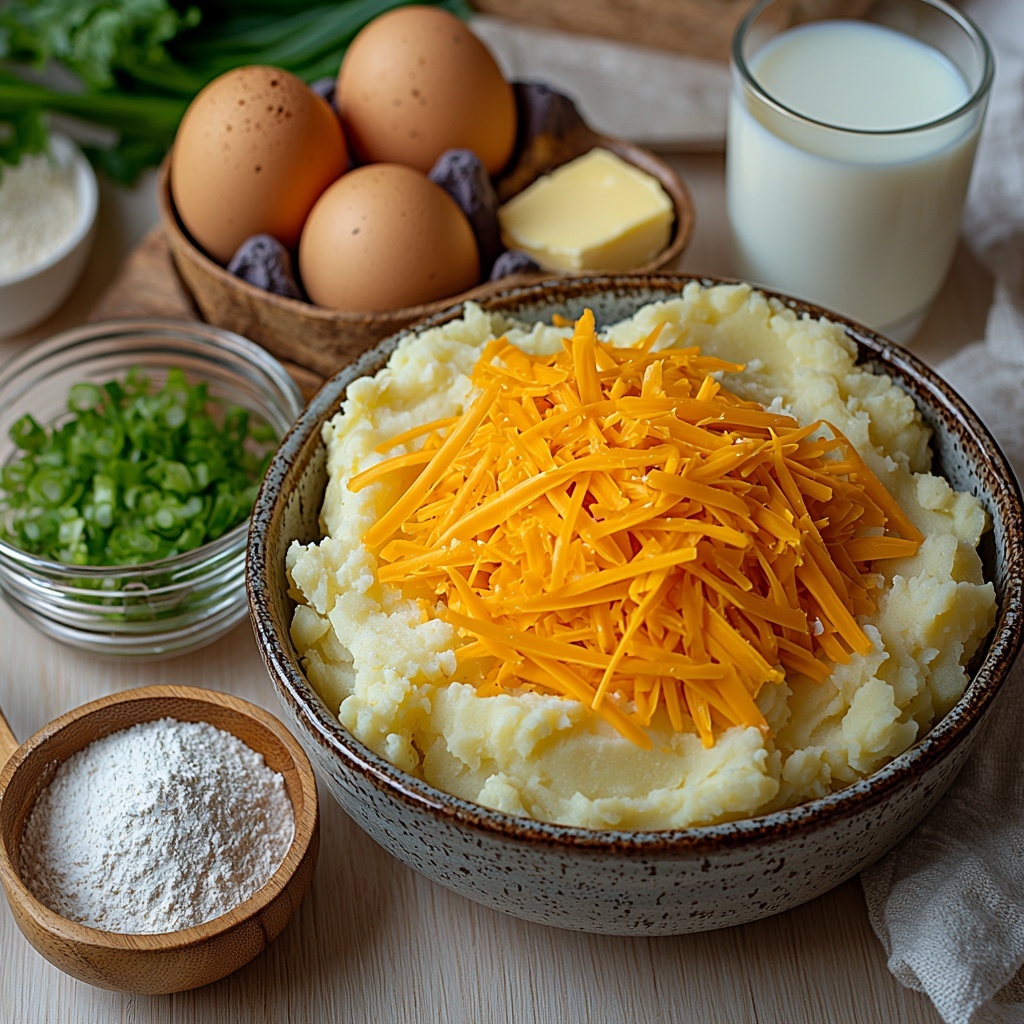- Combine Base Ingredients: In a large mixing bowl, combine the mashed potatoes, shredded cheddar cheese, beaten eggs, and chopped green onions (if using) until evenly mixed.
