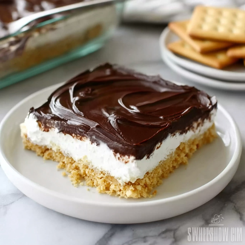 When ready to enjoy, slice your chilled cake into squares and serve cool. Each bite offers the perfect balance of creamy vanilla, crunchy cracker, and smooth chocolate ganache—pure bliss!