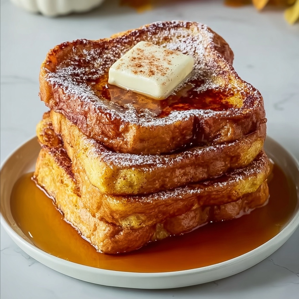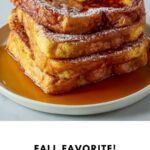 Serve your golden pumpkin French toast stacked and topped generously with the caramelized apples. Add a pat of butter, a drizzle of maple syrup, and a sprinkle of powdered sugar to complete this seasonal masterpiece.