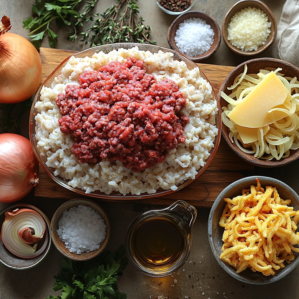 The beauty of this casserole lies in its simplicity. Each ingredient plays a key role in creating the layers of flavor and texture, from the sweet caramelized onions to the tender ground beef and fluffy rice. Let’s dive into what you’ll need to bring this dish to life.
