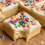 - Frost and Decorate: Evenly spread the frosting over the cooled cookie bars. Sprinkle extra decorative sprinkles on top and let the buttercream set before slicing into bars.