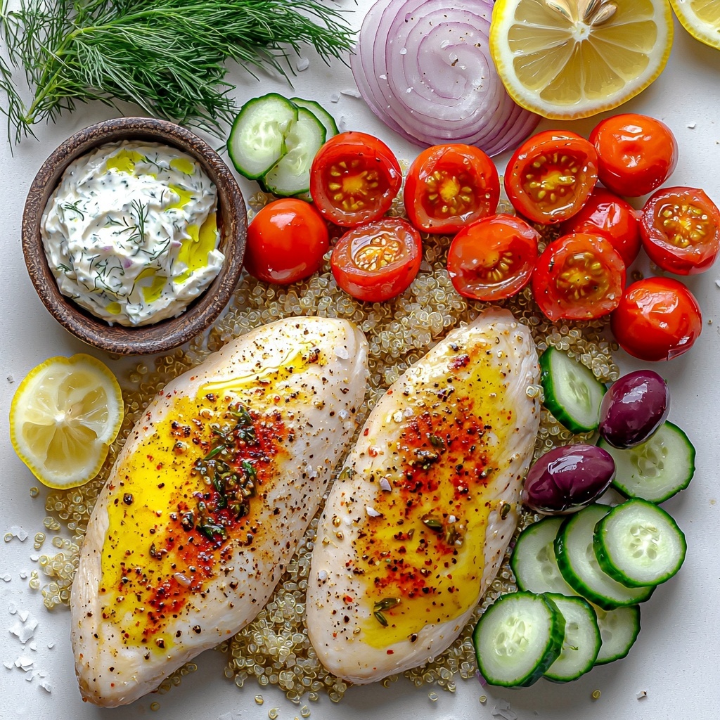 These ingredients are delightfully simple yet essential, each bringing their own magic to the Greek Chicken Bowl Recipe. They combine fresh, herby, creamy, and savory elements to create a meal that is colorful, balanced, and utterly delicious.