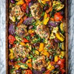 This Greek Sheet-Pan Chicken recipe offers a vibrant and flavorful meal featuring tender chicken thighs baked alongside fresh vegetables, Kalamata and Castelvetrano olives, and tangy feta cheese. Coated in a zesty ladolemono dressing made with lemon, oregano, garlic, and olive oil, this one-pan dish delivers Mediterranean flavors with minimal cleanup – perfect for a quick and healthy dinner.