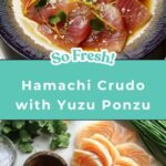Hamachi Crudo with Yuzu Ponzu Sauce is a bright, bold, and fresh Japanese-inspired dish that features thinly sliced sushi-grade yellowtail served with a tangy and aromatic yuzu ponzu dressing, garnished with shallots, serrano pepper, cilantro, and lemon zest. This light and elegant appetizer highlights fresh flavors and vibrant textures, perfect for a quick, no-cook seafood starter.