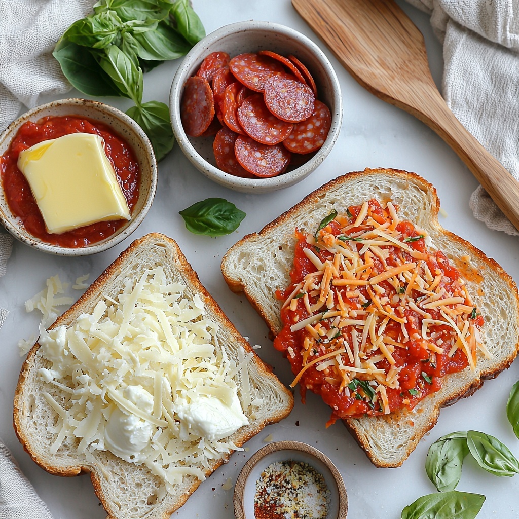 - Assemble the Sandwiches: Place the two slices of bread buttered side down on a clean, flat surface. Evenly spread marinara sauce inside each slice. Layer mozzarella cheese, Parmesan cheese, turkey pepperoni, and any other desired toppings on one slice. Then, top with the other slice of bread, buttered side up, to complete the sandwich.