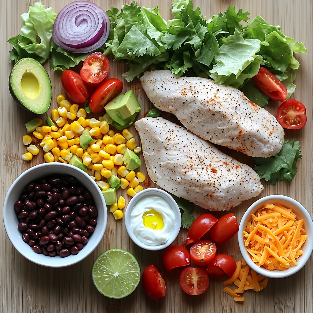 While the chicken grills, combine the rinsed black beans, corn kernels, diced red bell pepper, creamy avocado, chopped red onion, fresh cilantro, romaine lettuce, and halved cherry tomatoes in a large salad bowl. This medley creates a colorful, nutrient-packed foundation that balances softness, crunch, and creaminess all at once.