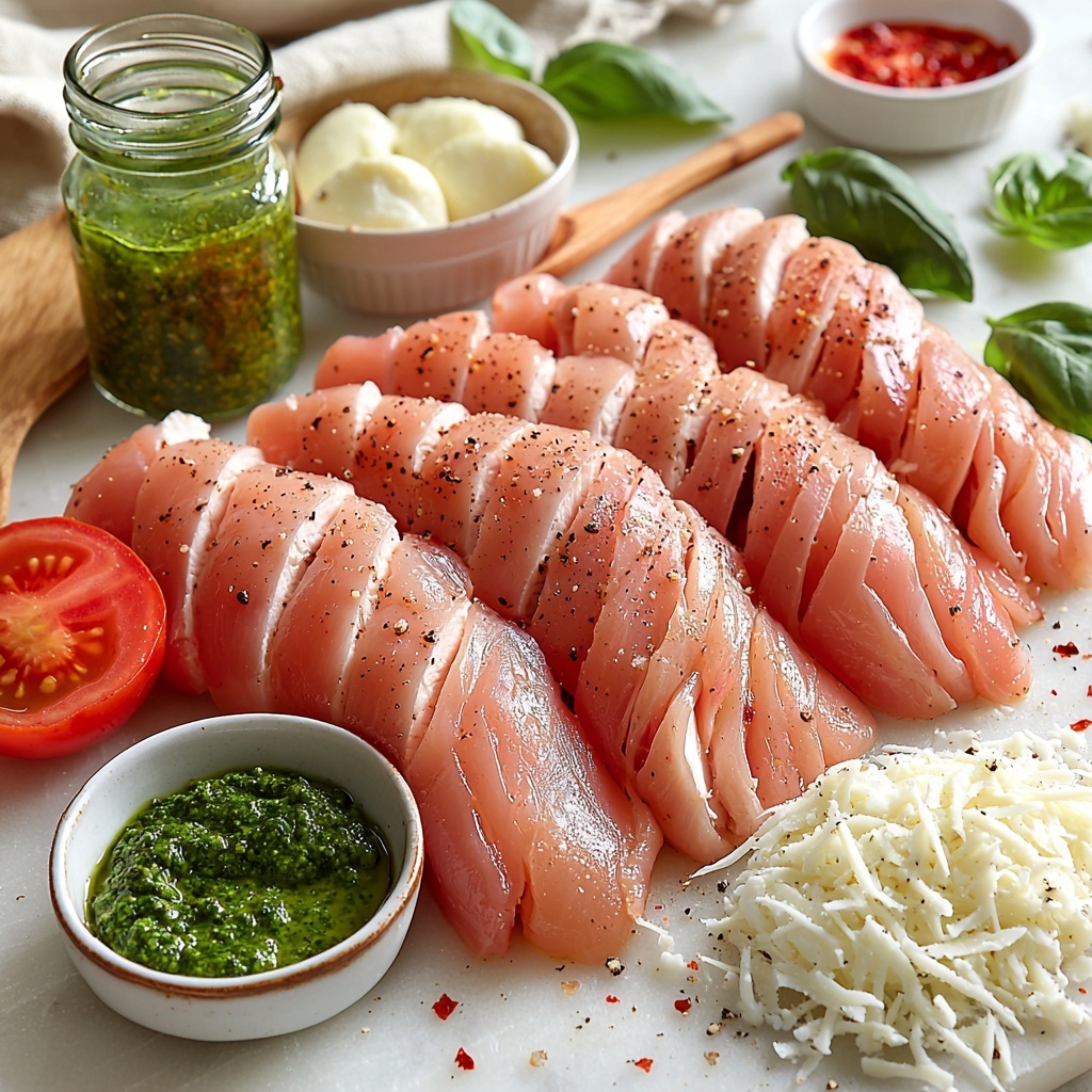 Gathering the right ingredients is the secret to bringing all those bold flavors together effortlessly. Each component is simple but essential: the mozzarella lends that irresistible gooeyness, pesto infuses layers of herbal richness, and parmesan adds a savory kick, while a perfectly seasoned chicken breast ties everything into one spectacular bite.