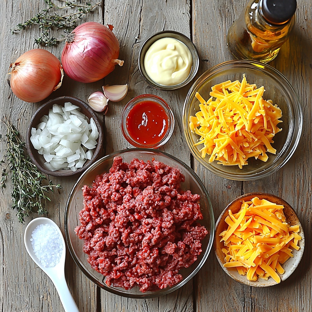 - 1 1/2 cups sharp cheddar cheese, shredded and divided (about 6 ounces total): Cheese is key for cheeseburger goodness—half mixed in and half on top for a golden finish.