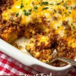- Assemble Casserole: Transfer the beef mixture to the prepared baking dish. Sprinkle the remaining 1/2 cup of shredded cheddar cheese evenly over the top.