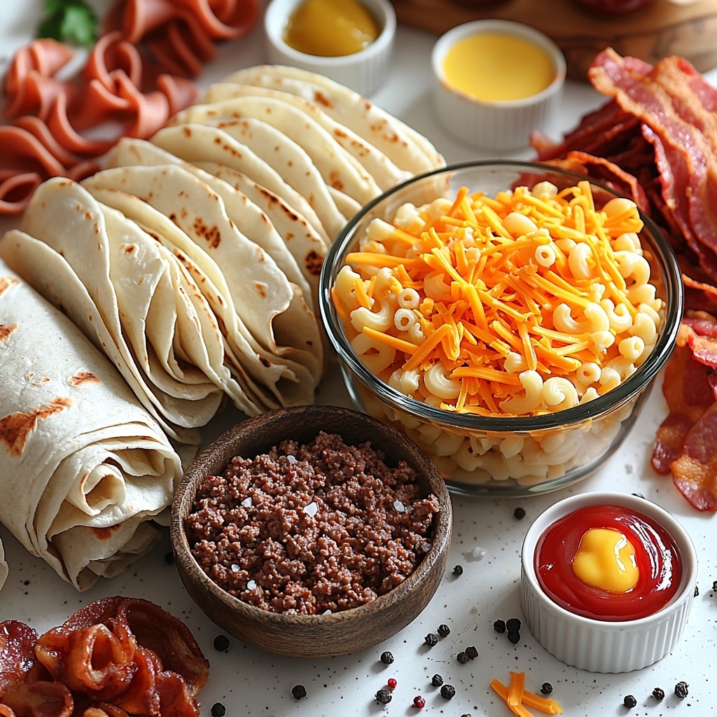 The beauty of this Mac Cheese Bacon Burger Rolls Recipe lies in its simple yet essential ingredients. Each one brings something special to the table, from the juicy seasoned beef to the creamy macaroni and melty cheddar cheese that binds everything together. Freshness from the tortillas wraps it all neatly for the final scrumptious bite.