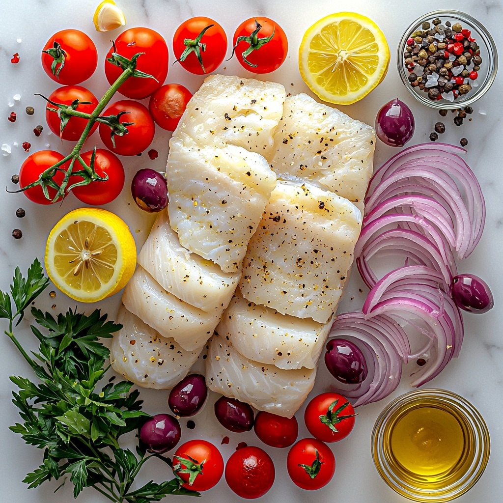 Nothing fancy here—just a handful of fresh, wholesome ingredients that come together to create something truly magical. Each plays a vital role, whether it’s the tangy burst from the lemon slices or the subtle heat from red pepper flakes, these ingredients are simple yet essential to the Mediterranean Baked Fish Dinner Delight Recipe’s irresistible charm.