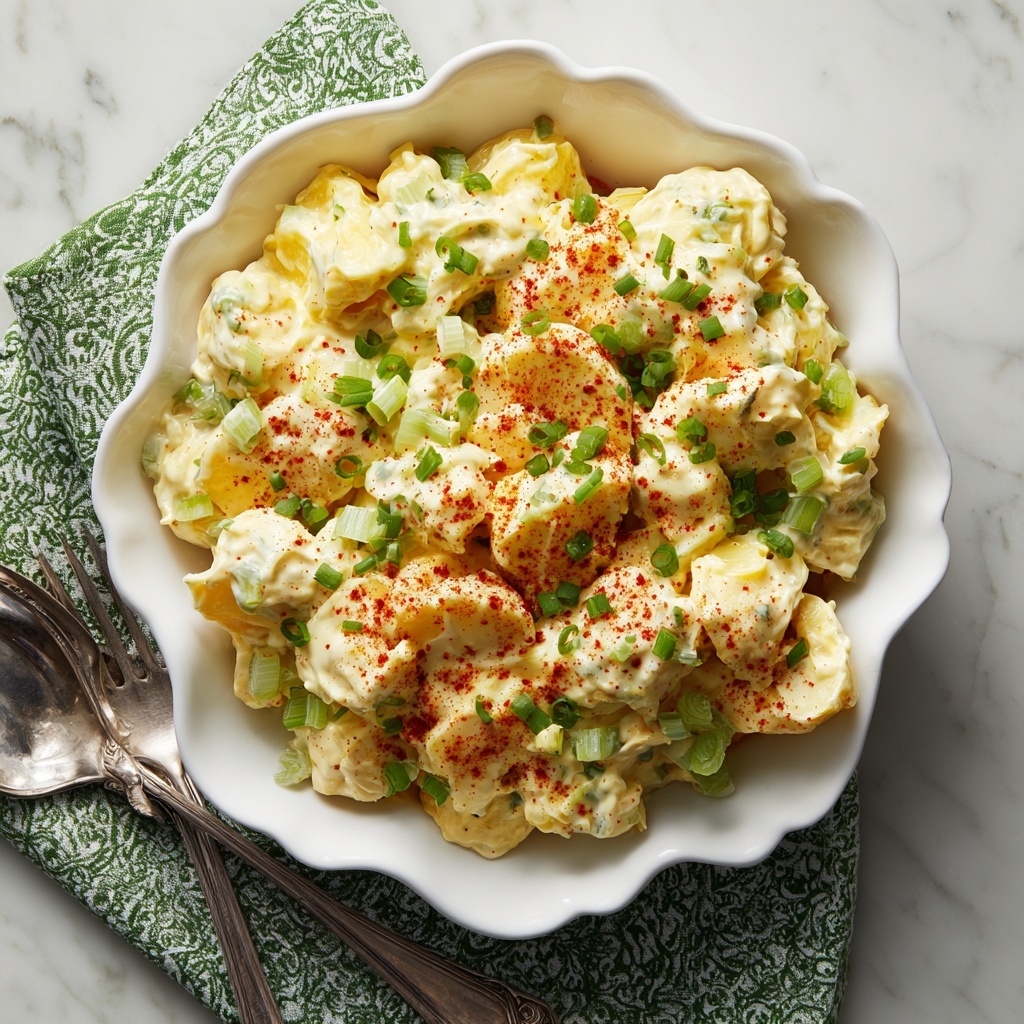This potato salad pairs wonderfully with grilled meats, barbecue ribs, or even as part of a picnic spread alongside sandwiches and fresh fruit. Its creamy tang helps cut through richer dishes while enhancing lighter fare.