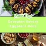 These Savory Georgian Eggplant Rolls are a delightful appetizer perfect for any gathering. Roasted eggplant strips are blended with walnuts and traditional Georgian spices to create a smooth, flavorful dip garnished with pomegranate seeds for a burst of sweetness and color. Easy to prepare and packed with rich, nutty flavors, this dish will impress your guests and adds a unique twist to your appetizer menu.