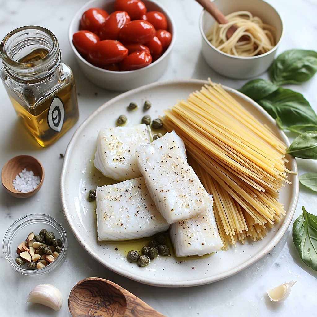 All the ingredients for this Sicilian Style Fish Pasta Recipe are straightforward, but each one plays a crucial role in creating the authentic flavors and textures that make this dish so memorable. From the silky white fish to the punchy capers and fragrant basil, every component adds its own special touch.