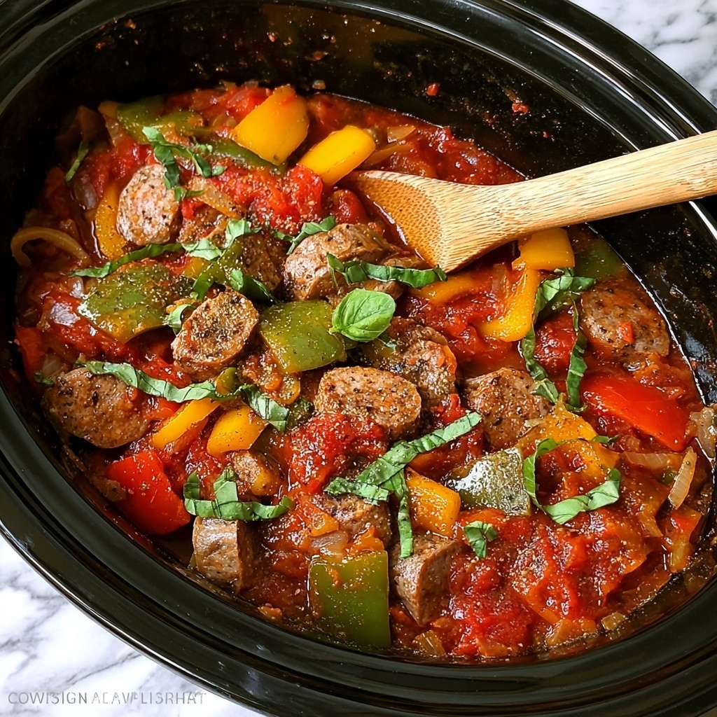 A hearty and flavorful Slow Cooker Sausage and Peppers recipe featuring Italian sausage, bell peppers, onions, and a savory tomato base. Perfect for an easy, comforting one-pot meal that simmers all day to meld the delicious flavors.