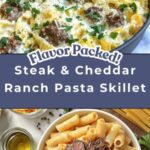 A hearty and flavorful Steak & Cheddar Ranch Pasta Skillet combining tender seared steak, creamy ranch dressing, sharp cheddar cheese, and perfectly cooked pasta for a quick and comforting meal in just 30 minutes.