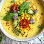 This Summer Sweet Corn Gazpacho is a refreshing, chilled soup perfect for hot days. Bursting with the natural sweetness of fresh corn and the vibrant flavors of yellow cherry tomatoes, cucumber, and bell pepper, it combines a smooth texture with a hint of tanginess from lemon and sherry vinegar. Garnished with fresh herbs and extra corn kernels, it’s a light, healthy, and visually appealing dish ideal as a starter or a light meal.