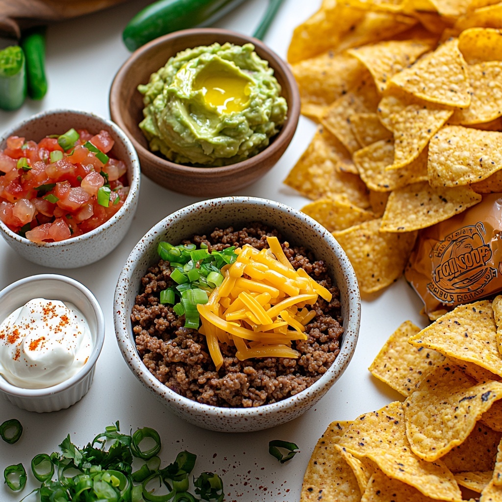 - Assemble the taco bites: Arrange the Tostitos Scoops tortilla chips on a large serving platter. Spoon approximately one tablespoon of the seasoned beef mixture onto each chip. Top each with your choice of sour cream, chunky salsa, shredded cheese, sliced green onion, and guacamole. Serve immediately to enjoy the perfect mix of crunchy, savory, and creamy flavors.
