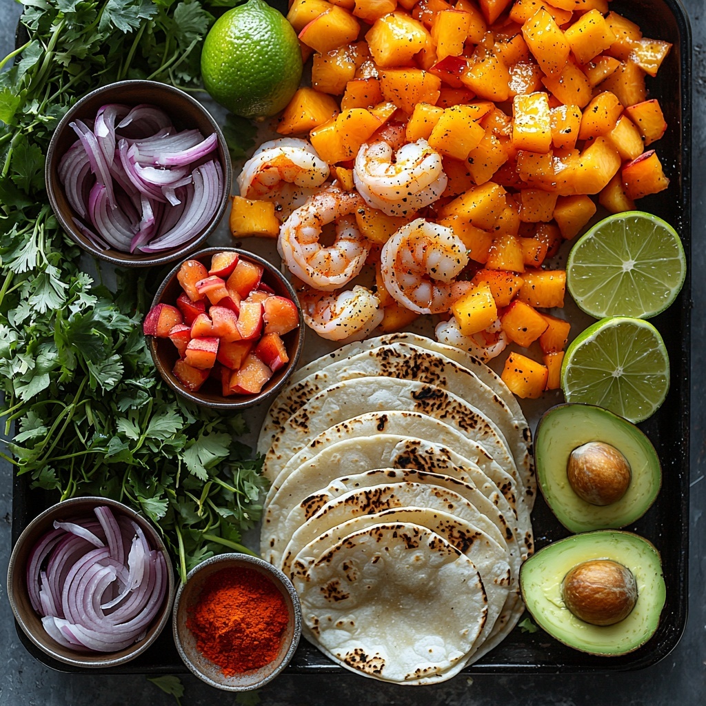 Layer the warm tortillas with grilled shrimp, a generous scoop of peach salsa, and slices of creamy avocado. You can finish with a quick squeeze of lime and a sprinkle of extra cilantro for that fresh, punchy finish. Each bite should be a perfect harmony of spicy, sweet, smoky, and creamy flavors.