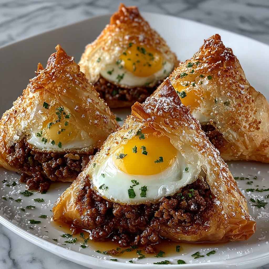 - Assemble pastries: Lay one phyllo sheet flat on a clean surface. If the sheets are very thin, stack two sheets together for sturdiness. Spoon 2 to 3 tablespoons of the meat mixture onto the center of the pastry. Carefully create a small well in the filling and gently crack an egg into this well. Optionally, sprinkle 1 tablespoon of grated Gruyère or mozzarella cheese on top of the filling.