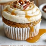 Once cooled, pipe the vegan vanilla cream cheese frosting on top of each cupcake. Drizzle with the maple syrup (or vegan caramel sauce) and sprinkle with pecans for that delightful crunch and added sweetness.